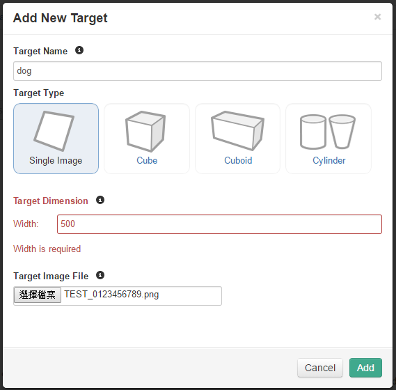 4. 分別輸入 Target Name (目標名稱)Target Type (目標類型)Target Dimension (目標維度)Target Image File (目標影像檔),如下圖依照自己的需求輸入或建立 (這邊小蛙還不太清楚 Target Dimension 要怎麼設定,先隨便設定 500,這跟你的 3D model 大小有關)